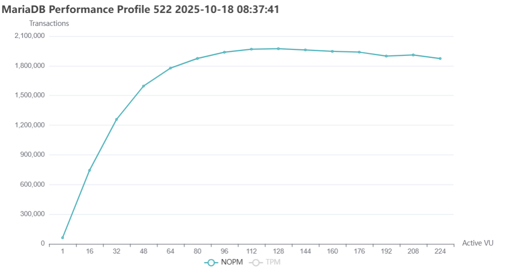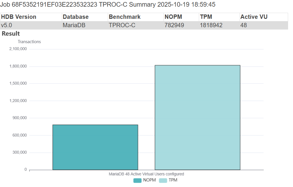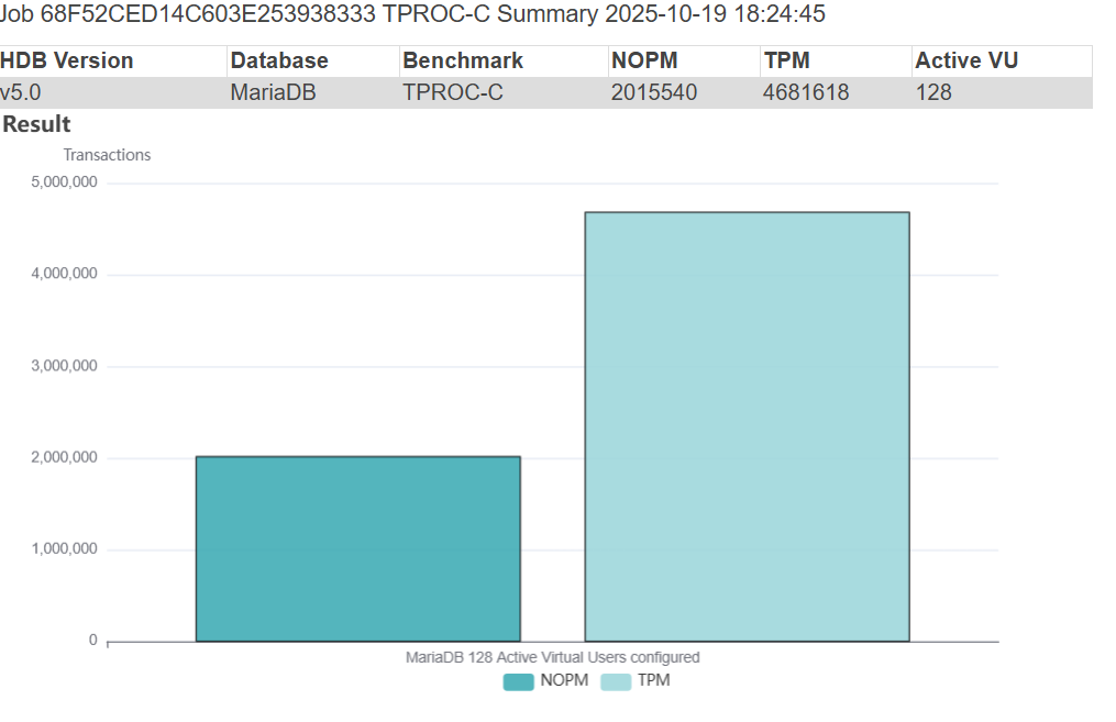 In 2025 HammerDB began working with MariaDB engineering to analyse OLTP scalability on modern hardware platforms and to identify architectural bottlenecks that limit throughput at scale. The goal was not to tune a benchmark, but to use accurate, comparable and repeatable workloads to identify fundamental serialization points in the database engine. You can read the blog post here on the results of that work: Performance Engineered: MariaDB Enterprise Server 11.8 Accelerates OLTP Workloads by 2.5x