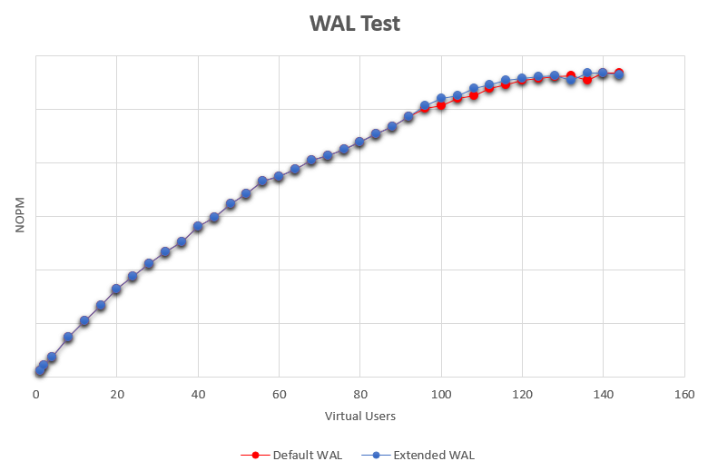 The HammerDB workload is based on and intended to be as close as possible to the example published in the TPC-C specification. As such the implementation is intentionally non-optimized or biased towards any particular database implementation or system hardware (being open source you are free to inspect all of the HammerDB source code). The crucial element is to reiterate the point made in the previous section that the HammerDB workloads are designed to be reliable, scalable and tested to produce accurate, repeatable and consistent results. In other words HammerDB is designed to measure relative as opposed to absolute database performance between systems. What this means is if you run a test against one particular configuration of hardware and software and re-run the same test against exactly the same configuration you will get exactly the same result within the bounds of the random selection of transactions which will typically be within 1%. Results Any differences between results are directly as a result of changes you have made to the configuration (or management overhead of your system such as database checkpoints or user/administrator error). Testing has proven that HammerDB tests re-run multiple times unattended (see the autopilot feature) on the same reliable configuration produce performance profiles that will overlay each other almost identically. The Figure below illustrates an example of this consistency and shows the actual results of 2 sequences of tests run unattended one after another against one of the supported databases with the autopilot feature from 1 to 144 virtual users to test modifications to a WAL (Write Ahead Log File). In other words HammerDB will give you the same results each time, if your results vary you need to focus entirely on your database, OS and hardware configuration.