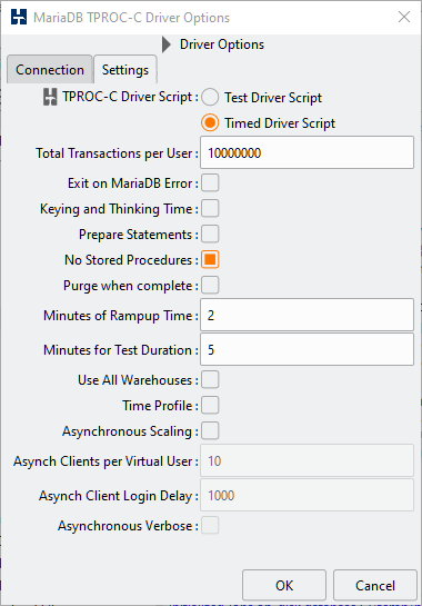 From version 4.9 for MySQL and MariaDB there is an advanced option of No Stored Procedures. When selected this option will drive the TPROC-C workload entirely from the client, running the same SQL statements with the application logic within HammerDB. This option is useful when looking to run a workload with an increased network load and in tests increases the Bytes received and Bytes sent by 6X and 8X respectively. This option should not be expected to deliver NOPM/TPM values as high as using stored procedures due to the additional time spent at the network.