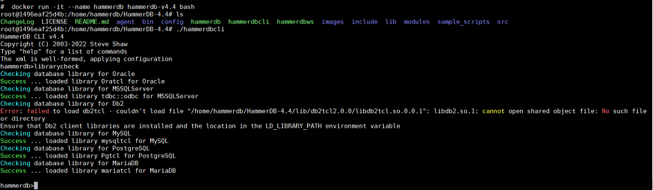 To create and start a container named "hammerdb" with the image built in previous section run the following command. The container build is successful but the client libraries for IBM are not installed.