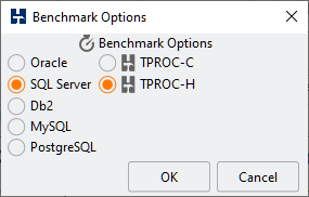 To create the analytic test schema based on the TPROC-H you will need to select which benchmark and database you wish to use by choosing select benchmark from under the Options menu or under the benchmark tree-view. The initial settings are determined by the values in your XML configuration files. The following example shows the selection of SQL Server however the process is the same for all databases.